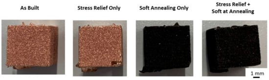 After heat treatment (soft annealing), the electric conductivity rises from 44.72 MSm−1 (as built and sandblasted) to 47.46 MSm−1 7.77 MSm−1 (refer to Figure 10), which is an increase of 6%. As previously discussed, grain boundaries reduce electric conductivity. An increase in grain size reduces the overall number of grain boundaries, thereby increasing electric conductivity. This indicates a trade-off between mechanical properties (i.e., hardness) and electric conductivity. Electric conductivity requires a large grain size, whereas a small grain size is required for high hardness. While the focus of this study lies on electric conductivity, it is expected that thermal conductivity is significantly affected by similar factors, i.e., defects, grain boundary angles and grain size. Since pure Cu was investigated and a 99.99% relative density was achieved, it is expected that the thermal conductivity can be calculated using CALPHAD methods.