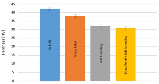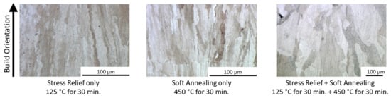 The microstructures of the heat treated samples are shown in Figure 8. As can be seen, the grain sizes are larger compared to those shown in Table 3 and increase with increasing heat treatment temperatures, due to grain coarsening. However, the grains do remain oriented in the build direction. Accordingly, Vickers hardness decreases with increased heat treatment temperatures and durations (see Figure 9), according to the Hall–Petch Relation, which states that larger grain sizes lead to reduced hardness. The maximum hardness was measured in the as built condition with 42 HV. The lowest hardness was 31 HV in stress relieved and soft annealed samples. For a higher hardness, a fine and equiaxed microstructure is required. In order to achieve an equiaxed microstructure, a hardening step, with subsequent quenching causing recrystallization during heat treatment, should be considered in future studies.