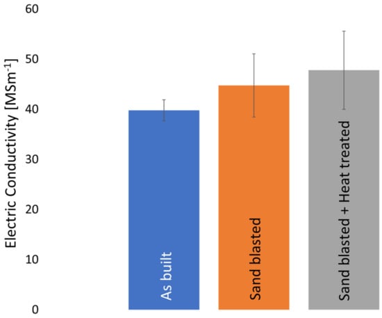 A decrease in surface roughness led to an improved electric conductivity, as seen in the measured electric conductivity after sand blasting in this study. The electric conductivity increased from 38.9 MSm−1 (as built condition) to 44.72 MSm−1 6.29 MSm−1 (as built and abrasively post-processed). This corresponds to an increase of 12% compared to the as built condition.