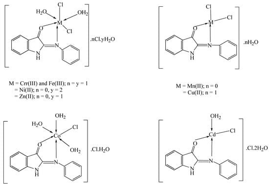 - Konstantinovic, S.S.; Radovanović, B.; Cakic, Z.; Vasić, V.M. Synthesis and characterization of Co (II), Ni (II), Cu (II) and Zn (II) complexes with 3-salicylidenehydrazono-2-indolinone. J. Serb. Chem. Soc. 2003, 68, 641–647. [Google Scholar] [CrossRef]