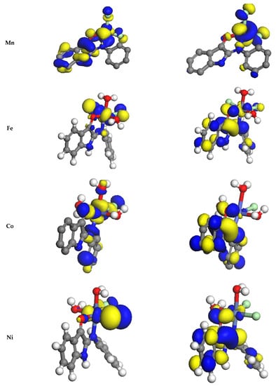 Occupied higher energy and unoccupied lower energy molecular orbitals of Cr(III), Mn(II), Fe(III), Co(II), Ni(II), Cu(II), Zn(II), and Cd(II) complexes.