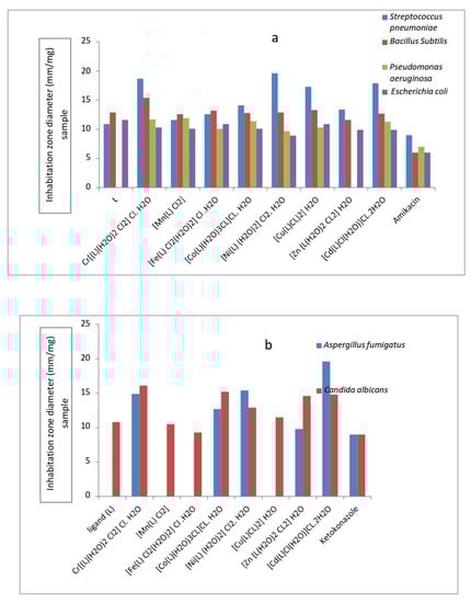 The solubility, conductivity, and length of the link between the metal and ligand also play a role in the rise in activity [65]. The Schiff base ligand and its complexes were studied for their potential antibacterial and fungicidal effects. Table S4 and Figure 5 results show that the complexes had more potent inhibitory effects than the parent ligand. Streptococcus pneumonia, Bacillus subtilis, Pseudomonas aeruginosa, and Escherichia coli were used as test organisms for antibacterial activity in vitro. The following was discovered to be the order of antibacterial activity: