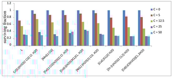 By computing the activity index in accordance with the following relation, as shown in Figure S8, the activities of the produced Schiff base ligand and its metal complexes were verified [66,67,68]: