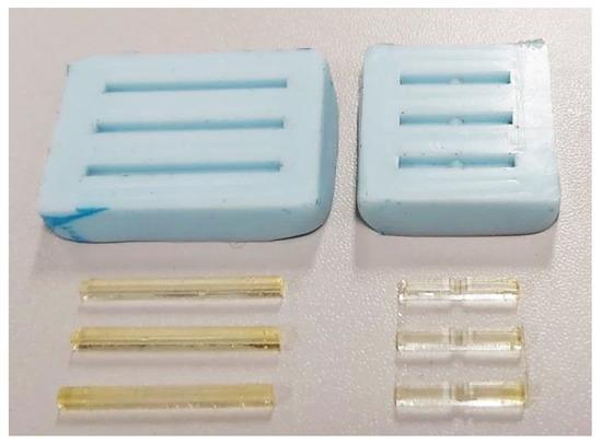 The mold for sample manufacturing (Figure 1) was made by pouring a two-component Siliform series casting silicone (Dreve Dentamid, Unna, Germany) on the model plates. Siliform is characterized by a high degree of accuracy in reproduction, high dimensional stability over time and its shrinkage is 0.3%, which guaranteed the desired dimensions of the samples.