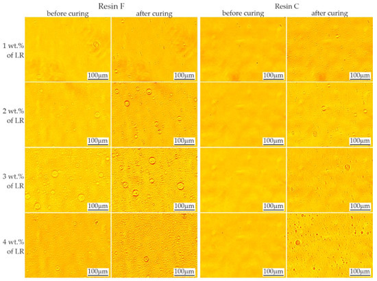 The evaluation of the rubber solubility is shown in Figure 2. In the case of resin C with a lower viscosity, addition of LR in the range of 1–4 wt.%. produced no visible domains before the polymerization process. The domains were revealed after the process as fine spherical particles. On the other hand, resin F, which has a higher viscosity, did not tend to dissolve the rubber. The presence of rubber domains in this resin was noticeable even with 1 wt.% LR. Since only the BisGMA/TEGDMA resin ratio was changed in the blend, it can be assumed that the LR was dissolved by the lower viscosity resin (TEGDMA). Increasing the viscosity and molecular weight as a result of initiating the polymerization process altered the solubility conditions of the liquid rubber, causing the appearance of second phase precipitations—the LR domains.