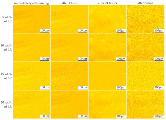 The effects of mixing the resins with 5–20% by weight of liquid rubber and the time stability of the mixtures are shown in Figure 3 and Figure 4, respectively. When the LR concentration was increased up to 5 wt.%, domains with diameters ranging from less than 1 μm to approx. 50 μm were observed. With increased LR content, numerous domains were observed, even immediately after mixing, in accordance with the equilibrium system for the two-component polymer system [25]. Based on microscopic observations, the ultimate solubility in the C resin at ambient temperature can be determined as approx. 5%. Above this concentration, the presence of a second phase was observed, the amount of which increased with time, possibly due to the mixing shear forces dissapear. After 24 h, no changes in the size or morphology of the rubber domains were observed in the tested materials.
