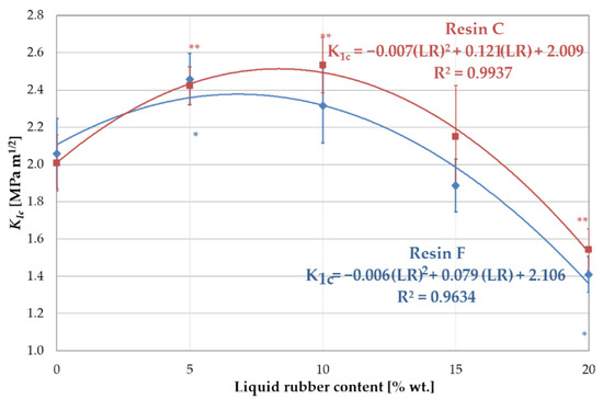 Fracture toughness KIc of resin blends modified with liquid rubber. Symbols (*) and (**) indicates statistically significant differences in relation to the unmodified resin, for resin F and C, respectively.