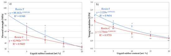 An exponential decrease in flexural strength was observed with increasing LR concentration (Figure 7a). For the unmodified resins, this strength was 91 MPa for resin F and 64 MPa for resin C. The influence of the lower viscosity of resin C on the strength value was clearly visible here. Increasing the liquid rubber content to 5 wt.%. resulted in a reduction in strength to 70 MPa and 62 MPa for resins F and C, respectively. The presence of LR reduced the stiffness of the resin network, possibly due to a decrease in the crosslink density. The insolubility and low compatibility of LR with resin F, and the percentage of the dispersed rubber phase was more significant than resin C.