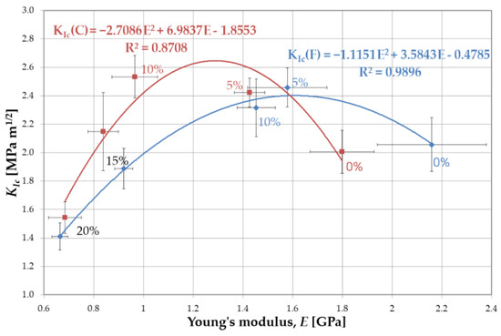 The obtained results made it possible to the develop the relationship KIc = f(E) for resins F and C (Figure 10). The data was approximated with the 2nd degree polynomial, which determined the maximum value of fracture toughness. This, in turn, made it possible to define the optimal concentration of liquid rubber.