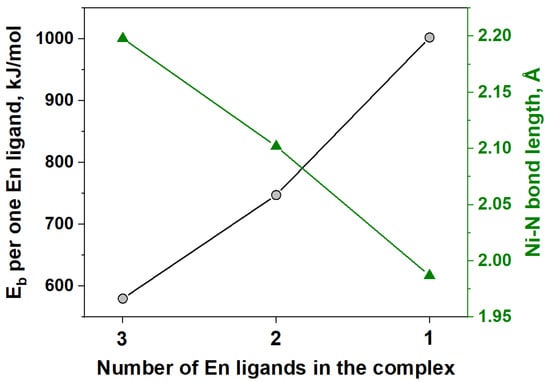 It is known from the literature [34,35,58] that the thermal decomposition of ethylenediamine complexes of transitional metals with non-oxidizing anions (Cl−, Br−) is characterized by a step-by-step process of elimination of ethylenediamine from the coordination sphere of metal. In our case, the perchlorate anions are present in [Ni(En)3](ClO4)2, which can decompose and/or oxidize the ethylenediamine. Indeed, numerous results on the thermal decomposition of different complexes that contain organic ligands as fuels and anions (ClO4−, NO3−) as oxidizing agents are discussed in the literature, the heating of which results in an intense exothermic process of their gasification [35,36,37,59,60,61,62,63,64]. At the same time, it should be noted that the DFT calculations (Figure 2) confirm that the Ni-En bonding energy (Eb) is relatively low for [Ni(En)3]2+ (Eb = 580 kJ/mol), and consequent removal of En ligands shortens and strengthens the bonds of the remaining ones (Eb = 748 kJ/mol and Eb = 1002 kJ/mol for [Ni(En)2]2+ and [Ni(En)]2+, respectively). Additionally, [Ni(En)2](ClO4)2 is a known compound that can be prepared separately [33]. Thus, the removal of ethylenediamine ligand is expected in the case of [Ni(En)3](ClO4)2 as well.