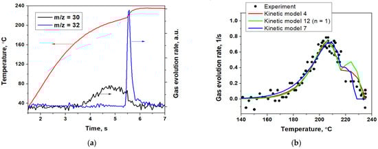 Therefore, firstly, it is important to know whether the process of ligand elimination without its oxidation occurs in the case of [Ni(En)3](ClO4)3 complex thermolysis. The dynamic mass-spectral thermal analysis (DMSTA) method was utilized for this purpose. The DMSTA curves of evolved gases (Figure 3a) show that under the conditions of the high heating rate (~15 °C/s) the evolution of the gas with m/z of 30 begins at 180 °C. Since NO evolution is unlikely to occur in such high concentrations when the decomposition of perchlorate anions [65] has not yet begun, we believe that this is caused by the emission of ethylenediamine rather than nitric oxide. In addition, the exothermic effect characteristic of redox transformations of organic compounds [11,66] is not observed in this stage of gas evolution. The intensity of m/z = 30 reaches its maximum at 205 °C, and at 215 °C an intense evolution of oxygen begins, accompanied by an increase in heating rate from ~15 °C/s to ~50 °C/s due to the exothermic effect of the chemical reactions. It should be noted that the observed exothermic effect can be attributed both to the perchlorate decomposition [65,67] and to the redox transformations in the “ethylenediamine-perchlorate” system [36]. The increase in the heating rate causes an increase in the ethylenediamine evolution rate, and at 235 °C the process stops.