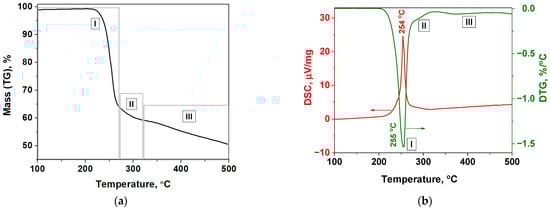 Thermogravimetric analysis shows integral and differential mass loss during heating, which, together with DMSTA results, makes it possible to investigate the reaction mechanism. During the thermogravimetric analysis of [Ni(En)3](ClO4)2 decomposition with the heating rate of 5 °C·min−1 (Figure 4) a fast weight loss (~35%) is observed in the temperature region of 210–270 °C (I) with the maximum on the DTG curve at 255 °C. This process is accompanied by an intense heat release (Figure 4b). Further, in the temperature region of 270–320 °C, another exothermic process is observed, which is characterized by a significantly lower mass loss rate (II). This process appears as a shoulder on the DTG curve in this temperature range. The total mass loss in these two regions was 40.4%.