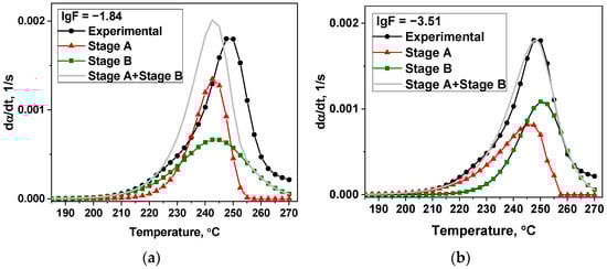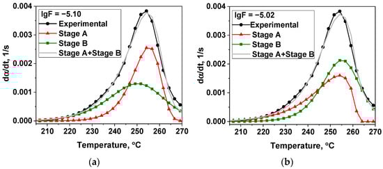 We believe that the unambiguity of the kinetic model selection during the modeling of the simulated DTG curve (described in Section 3.1) and the impossibility of choosing the correct kinetic models based only on the optimized values of F (Equation (6)) when modeling the real experimental data are due to the influence of different chemical and physical processes, as well as conditions of thermal analysis experiments [11].
