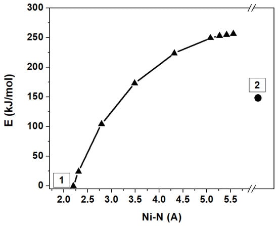 The profile of relative energy of the NEB-CI path for elongation of Ni−N bond during the elimination of one En molecule from [Ni(En)3]2+, where 1 is the initial [Ni(En)3]2+ state and 2 is fully optimized [Ni(En)2]2+ + En system.