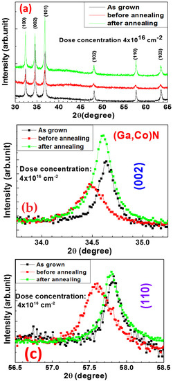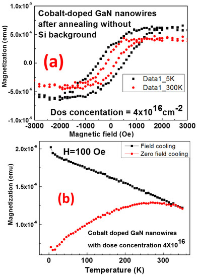 - He, J.; Wang, Z.S.; Li, M.; Fu, D.J. Structural and magnetic characterization of cobalt implanted GaN films. Nucl. Instrum. Methods Phys. Res. B 2011, 269, 1041–1045. [Google Scholar] [CrossRef]