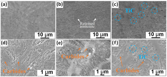 - The LMD-prepared TiC/H13 composite coating possessed refined martensite microstructures compared to the H13−W and H13−L samples, which could be a result of the high-temperature gradient, high undercooling, as well as the introduced TiC particles. The TiC ceramic particles demonstrated a finer size, uniform distribution, and good bonding with the H13 steel matrix.