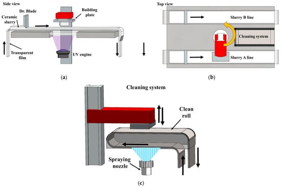 We intended to combine an electrically insulating, but mechanically strong, ceramic component with an electrically conductive ceramic material. It was decided that both materials should be co-processed by lithography-based additive manufacturing for increasing the geometrical freedom in the design of the manufactured component. Two lithography-based AM systems have been selected to print the test objects, namely a commercially available Lithoz printer [] and the multi-ceramic additive manufacturing process (Multi-CAMP). The Multi-CAMP process has been developed at the Korea Institute of Materials Science (KIMS) [,]. The Multi-CAMP technology (Figure 1a) uses the bottom-up approach of the lithography-based AM process where a whole layer of a light-curable suspension is exposed at once from below through a transparent carrier band to the light source consisting of a digital light module. The Multi-CAMP device has two carrier bands (A line and B line) on which different light-curable suspensions may be applied by different extrusion nozzles (Figure 1b). The extruded suspensions are smoothed into thin films by a doctor blade. Once the layer of material “A” is exposed to the light and solidified, the sample holder can be moved via rotation to the cleaning platform, which is located between the two carrier bands. The cleaning system in Multi-CAMP utilizes a spraying nozzle and cleaning roll, soaked with washing liquid, to remove any remaining ceramic slurry (as shown in Figure 1c). The printed element is “stamped” several times on the cleaning roll to remove any residual ceramic slurry. Once the element is cleaned, it is moved to carrier band B, where the second ceramic slurry is extruded, smoothed, and exposed to the light. The cleaning step is then repeated on a continuously replaced cleaning roll. This process is repeated until the green ceramic part is completed. Next, the green part is removed from the building platform and must be de-bound and sintered to attain the final ceramic properties.