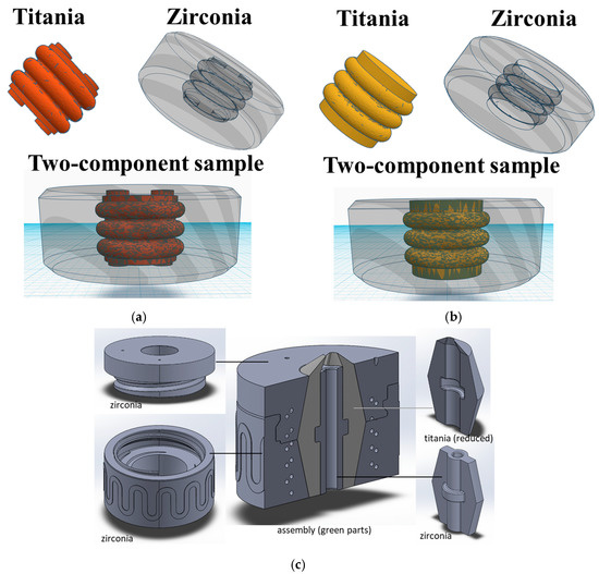 Schematic representation of two-component samples of type 1 (a) and type 2 (b) printed simultaneously by Multi-CAMP. Design of two-component element assembled after printing and sintered is presented in (c).