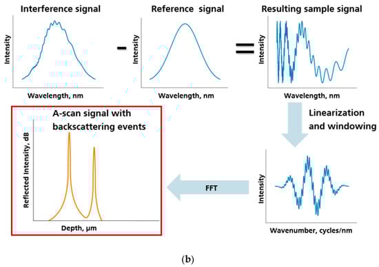 A schematic representation of an SD-OCT system is presented in Figure 3a []. A light source (laser or a super-luminescent diode) emits broadband, temporally short-coherent light with wavelengths from the near-infrared part of the electromagnetic spectrum. The light is split into two parts, namely a reference and a sample arm. The reference arm is terminated with a simple flat mirror, which serves as a reference reflector. The sample arm is terminated with an imaging system, often a combination of a 2-axis point-scanning system and telecentric lens, whose focal plane is set to be just below the sample surface. Depending on the transparence of the material, the light can penetrate the subsurface up to several millimeters in depth. It is partially backscattered at the sample surface and at scattering centers in the sample volume. The backscattered light interferes with the reference light and produces oscillations in the intensity as a function of wavelength. The interference signal is dispersed by a diffraction grating and the individual wavelength components are detected by an array detector (spectrometer). The background intensity from the spectral shape of the light source is then subtracted to isolate the interference pattern, which contains information related to the presence of the scattering centers within the sample. To convert it into a depth profile, Fast Fourier Transform is often used, requiring several pre-conditioning operations. The signal from the spectrometer is linear in the wavelength and must first be interpolated so that it instead becomes linear in wavenumber. A windowing function must be applied so that the signal is smooth and continuous at the edges. The so-called zero-padding is often used to smooth the final signal and improve the quality of any peaks present. Only then can the Fast Fourier Transform be applied. The use of a discrete Fourier Transform results in the loss of the sensitivity of the signal as a function of depth due to the finite sampling of the spectrometer [,].
