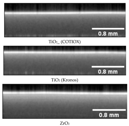Typical OCT results are presented in the form of either B-scans or C-scans. These are selected cross-sections or top views from a selected depth level, respectively. Both views contain valuable information about the sample’s homogeneity. Figure 5 presents examples of typical B-scans recorded on green samples of ZrO2 and TiO2 printed by the Lithoz printer.