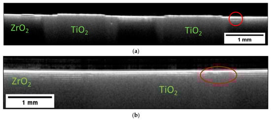 OCT tomograms were also obtained on the Multi-CAMP samples type 1 and 2. Selected examples of B-scans are presented in Figure 6 for green samples of type 1 and 2. In image (a) we can distinguish differences in the regions consisting of ZrO2 (matrix) and the two circular structures of TiO2. The main difference is the pronounced layered character of the ZrO2 in contrast to the homogenous appearance of TiO2. Small variations in the ZrO2 region are easily visible as they affect the continuity of the printed layers. In some areas the line contrast appears to be stronger. This means that the light is backscattered to a larger extent in those areas, indicating larger differences in the optical properties at the interface between two subsequent layers. Such variations in the amplitude of the optical signal along one horizontal line may indicate process variations during the application of the next layer.
