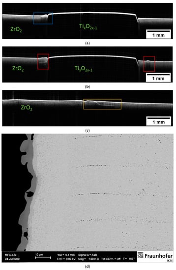 Let us compare the B-scans presented in Figure 5 and Figure 7. It can be easily seen that the sintering process changed the effective optical properties of the two materials. The TiO2 now transformed into TixO2x−1 became opaque and the optical signal is already strongly backscattered at the surface. The pronounced changed in the optical properties of TiXO2x−1 is caused by a loss of lattice oxygen [,]. The ZrO2 region, on the other hand, became more transparent due to increased density. The layered character of this region is now more pronounced. One can easily count at least four layers. The reason for the enhanced visibility of the ZrO2 layers is the presence of small pores forming between the layers during the sintering. As the pores cause the light to backscatter, the layer interface appears as a separate structure. The layers are consistently visible within the whole imaged area, indicating a consistent presence of pores. An SEM image validating this explanation for the contrast of the OCT images is shown in (d). The SEM image also provides the opportunity to estimate the penetration depth of OCT for this 3-D-printed material after sintering. As mentioned in previous sections, the thickness of the layer in the green state was about 25 µm. The SEM image shows that the layer thickness shrank down to about 16 µm after the sintering. As we can distinguish about six to eight layers in the corresponding B-scans shown in Figure 7a–c, the estimated penetration depth for this OCT system was about 130 µm.