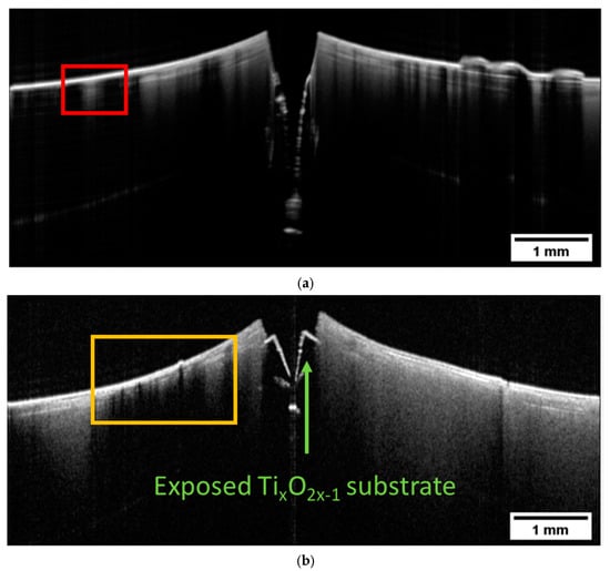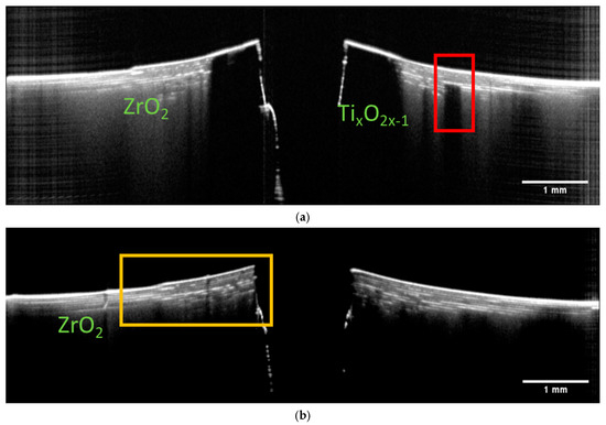 B-scans were also measured on Multi-CAMP samples. Selected examples of B-scans measured on sample type 1 are presented in Figure 8. They show the cross-sections of a deformed sample with an obvious fracture caused by the premeditated defects introduced to the samples during the printing process. This result shows what happens when the difference in the thermal expansion coefficients of the two components and the complex architecture of the structure is not accounted for. The layer of the ZrO2 peeled off and exposed the underlying TixO2x−1. Again, the TiO2 becomes opaque after the sintering due to the loss of lattice oxygen, whereas the ZrO2 becomes more transparent due to the increased density. However, the variations in the ZrO2 are very complex. In some parts, the ZrO2 appears to be transparent (the left side of the Figure 8a), while in others, the sample is more turbid with visible layers. Even though the B-scans were obtained on the same sample, the appearance of the ZrO2 in image (a) differs significantly from that in image (b).