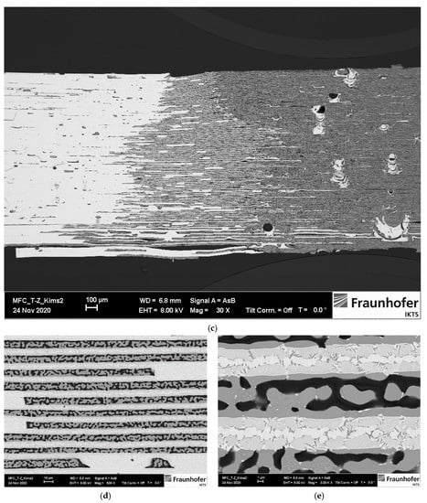 Intensity-averaged B-scans calculated from subsequent B-scans measured in relevant regions on the sintered Multi-CAMP sample of type 1 in (a,b). SEM images in (c–e) show the mutual contamination within the phase boundary. ZrO2 and TixO2x−1 are overlapping. Large pores can also be detected.