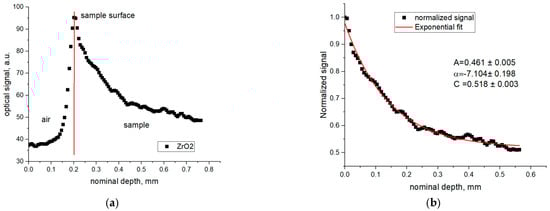 Example of a typical A-scan recorded on green 3 D-printed ZrO2 sample in (a). Surface of the sample is represented by the signal maximum. The optical signal decays exponentially within the sample because of dominant scattering within the sample. The signal was normalized to the maximum value and the resulting data (b) were fit with an exponential decay curve.