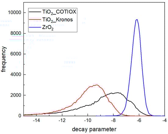 Distribution of decay parameter determined for A-scans measured on 3-D-printed green samples of TiO2_COTIOX, TiO2_Kronos, and ZrO2.