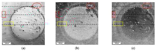 All the three images in Figure 15 show the complex fracture. Small variations in the light intensity at the surface are also visible. However, those variations are not as strongly pronounced as those visible in the decay parameter image shown in Figure 15b. The two TixO2x−1 structures appear relatively uniform; however, strong variations are visible within the ZrO2 region. Three exemplary areas were selected and marked with differently colored rectangles. There, the corresponding B-scans were isolated and intensity-averaged. The results are presented in Figure 16.