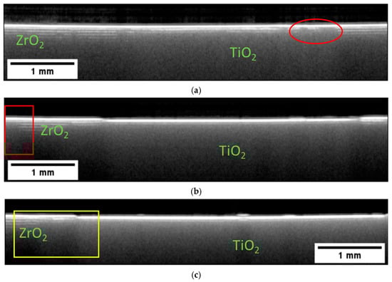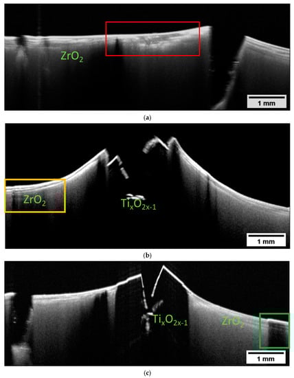 To finish the overview, in Figure 9 we present the B-scans obtained on the two-component sample of type 2. Again, the sample is fractured, and the surface is strongly deformed. There is a clear distinction between the opaque TixO2x−1 and ZrO2. In this case, we can see variations in the optical properties of the ZrO2 as a function of depth. We have regions with more translucent ZrO2 followed by regions where light was strongly backscattered. Even opaque structures can be distinguished (right side in Figure 8a). The layered structure of ZrO2 is strongly pronounced.