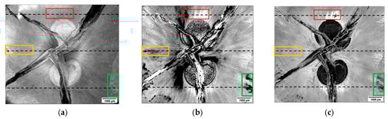 Subsequent B-scans were intensity-averaged. They were selected from regions marked in Figure 15 with (a) red (b) yellow, and (c) green rectangles. Features visible in the B-scans correlate well with the corresponding variations in the values in the decay parameter.