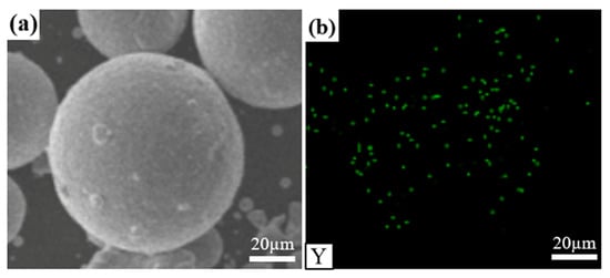 The particle size of the white spherical Y2O3 powder used in this study was in the range of 50–100 nm with a purity of 99.9% and a melting point of about 2415 °C. The Y2O3 powder was added into the NiCoCr-based superalloy powder by employing a ball milling (XQM-04 vertical planetary mill, rotation rate = 300 r/min, duration = 3 h, ball-to-powder ratio = 2:1). The results of SEM imaging and Y-element EDS spectroscopy for the NiCoCr-based superalloy powder containing Y2O3 are provided in Figure 2a,b, respectively. As can be seen in the figure, Y2O3 was homogeneously distributed on the surface of the NiCoCr-based superalloy powder after the ball milling process, wherein no significant aggregation was observed, which favors the synthesis of Y2O3/NiCoCr-based composite powder by LMD.