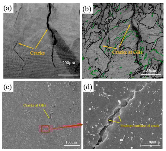 Figure 4a shows the crack morphology of the NiCoCr-based superalloy prepared by LMD. The high-angle and low-angle grain boundaries of the crack zone as processed by Channel 5 software are shown in Figure 4b. Herein, green lines represent low-angle grain boundaries (2° < orientation difference < 15°), whereas the high-angle grain boundaries (orientation difference > 15°) are represented by black lines. An analysis of the figure based on this representation clearly suggested that cracks were initiated at the grain boundaries and that they exhibited significant intergranular crack features.