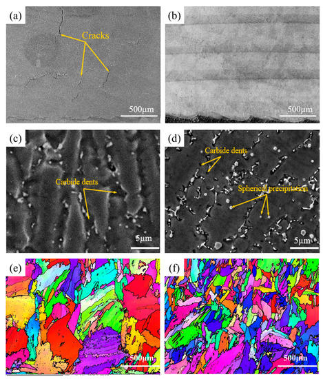 Figure 4c shows the morphology of the formed cracks after erosion in the NiCoCr-based superalloy prepared by LMD. These cracks caused drastic reduction in stability of the grain boundaries, resulting in a severe risk of irreversible damage during service of the deposited layer. A high-resolution SEM image of a crack is provided in Figure 4d. The crack in the SEM image can be seen to have a smooth surface on both sides, which can be attributed to the surface tension of intergranular liquid phase during its solidification. Additionally, traces of plastic deformation were observed, indicating that the crack was induced by the liquefaction process. Hence, it can be concluded that cracks generated in the NiCoCr-based superalloy during LMD were actually induced by liquefaction.
