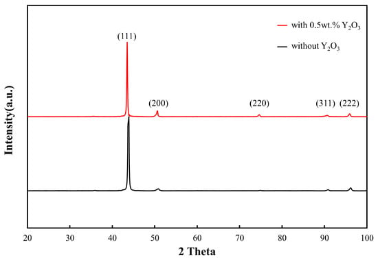 The inverse figure pole (IFP) maps obtained from the results of EBSD along the growth direction of the deposited layers with 0 wt.% and 0.5 wt.% Y2O3 are illustrated in Figure 6e,f, respectively. Obviously, columnar dendritic grains grow continuously along a specific direction and penetrate through multiple layers within the microstructure. This can be attributed to the highly oriented laser-induced temperature gradient in the LMD technique. Especially, for the deposited layer with 0 wt.% Y2O3, significant growth of the columnar dendritic grains took place, where the average aspect ratio of the grains was found to be approximately 10:1. In comparison, for the deposited layer with 0.5 wt.% Y2O3, the columnar dendritic grains did not grow as much, and their average aspect ratio was limited to approximately 5:1. The addition of Y2O3 led to significantly reduced grain size. Previous studies show that finer grains are more vulnerable to rotation and deformation during rapid solidification of molten pool and are more resistant to strains of the molten pool in a semi-solid state, thereby preventing crack initiation and propagation within them during the solidification process [21]. Finer grains allow for effective tuning of the stress distribution during the LMD process [22,23] and provide more complicated paths for crack propagation [24]. The XRD patterns were also compared in Figure 7. Additionally, it can be seen that both samples have typical FCC characteristics. With the addition of Y2O3, the intensity of grain orientations (200) and (220) are enhanced, which may be related to grain refinement, resulting in a slight increase in anisotropy; however, Because of the low content of Y2O3 (0.5 wt.%) and the strong tendency of epitaxial growth of NiCoCr-based superalloy, there is no significant difference between the XRD patterns. Therefore, initiation and propagation of cracks posed a more serious challenge in the deposited layer with 0.5 wt.% Y2O3 in comparison to that in the deposited layer with without Y2O3.