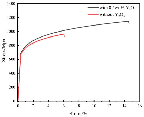 The tensile test results for the NiCoCr-based superalloy as well as the Y2O3/NiCoCr-based superalloys prepared by the LMD technique are shown in Figure 8. The calculated yield strengths of the two alloys obtained from these results were found to be 681 MPa and 692 MPa, respectively, whereas their tensile strengths were calculated to be 970 MPa and 1148 MPa, respectively (increase by 18.3%). Additionally, their elongations were found to be 6.1% and 14.4%, respectively, which shows an increase by 136% for the alloy with 0.5 wt.% Y2O3. Their yield ratios were 0.72 and 0.61, respectively. Theoretically, an increase in the yield ratio is reflected as a decrease in the deformation strengthening capability, and a corresponding decrease in the strain hardening index results in an increased risk of brittle failure [25]. According to their tensile curves, the elastic deformation stages of the two samples were highly consistent (stress–strain curves were linear, and the slopes were identical); however, the sample with 0.5 wt.% Y2O3 exhibited a slightly higher tensile slope and better plasticity at the beginning of the plastic deformation stage. Additionally, the elongation was significantly enhanced, which implied that both the plasticity as well as the toughness of the alloy had improved greatly.