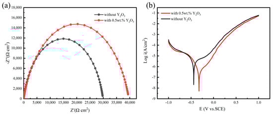 (a) Nyquist diagram, (b) Tafel polarization curves for 0 wt.% and 0.5 wt.% Y2O3.