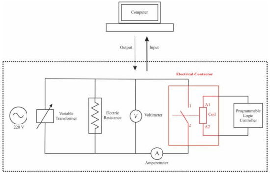The electrical contact tests of the Ag-SnO2-ZnO samples were carried out with homemade equipment. A schematic diagram of the system is shown in Figure 1. The sintered samples were installed in a commercial contactor Mitsubishi model S-N35 and tested for 5000, 10,000, 15,000, 20,000, and 25,000 on-off switching operations in a resistive circuit at a voltage of 220 V AC, current of 35 A and operation frequency of 30 times per minute. The mass loss of the samples was measured in a precision electronic scale Denver Instrument model TP-124. The morphology and chemical composition of the eroded contact surface were analyzed by FEG-SEM. The variation of electrical conductivity during the contact tests was determined using the Sigma Scope SMP10 equipment (London, UK). Additionally, the microstructure present in the eroded surface was analyzed by XRD.