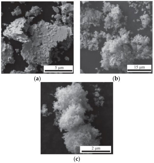 The morphology of the starting powder is shown in Figure 2. It can be seen that the Ag powders are formed by flake-shape agglomerates, while the oxide powders (SnO2 and ZnO) are constituted by rounded agglomerates from fine particles. The maximum agglomerate size observed is in accordance with that reported by the manufacturer in each case (Ag < 10 µm, SnO2 < 44 µm, and ZnO < 5 µm).