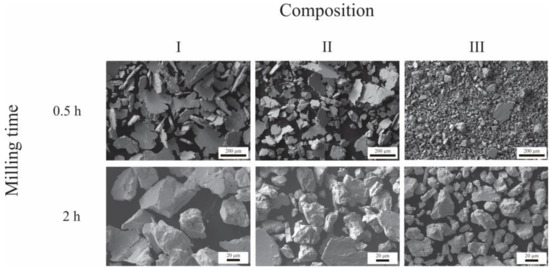 Figure 3 shows SEM images of the powders milled for 0.5 h and 2 h for the three compositions under study. It can be seen that, after 0.5 h of milling, the powders comprise flat agglomerates produced due to the ductile nature of Ag, which is plastically deformed. After 2 h of milling, the morphology of certain agglomerates changes from lamellar to equiaxed. This occurs due to an increase in the density of dislocations and the powders’ embrittlement, causing the fracture to prevail over plastic deformation [41].