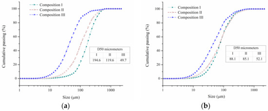 Particle size distributions of the powders after (a) 0.5 h and (b) 2 h of milling for the three compositions under study.