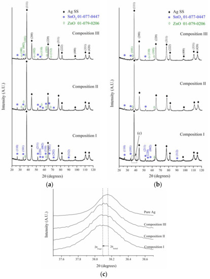 Figure 5c presents a magnified zone for the diffraction of the (111) plane of Ag for the samples milled during 2 h. The XRD pattern of pure Ag was incorporated for comparison purposes. A shift was observed in the position of the diffraction peaks of the milled powders toward lower 2θ angles. This behavior is related to the unit cell expansion of Ag due to the formation of a solid solution during the milling process. In this sense, Figure 6a shows the variation of the lattice parameter of Ag-rich solid solutions (Ag SS) as a function of milling time and composition. The lattice parameters were obtained from Rietveld refinements, using the MAUD software [40]. The lattice parameter of the solid solution increased with increasing SnO2 content in the initial combination of powders. It has been reported that, unlike Zn, whose incorporation into the Ag causes a contraction of its unit cell [44], Sn’s incorporation generates an expansion in the crystal structure of Ag due to its larger atomic volume, Ω (ΩSn 0.054 nm3 atom−1, ΩAg 0.017 nm3 atom−1) [45]. In this sense, the results obtained, supported by the evidence in the literature, suggest that, during the milling process, part of the SnO2 was destabilized, leading the Sn into the crystalline structure of the Ag matrix, thus forming a solid solution whose Sn concentration increases with increasing SnO2 content in the initial powders. At this point, the incorporation of small amounts of Zn into Ag during the milling process could not be ruled out. Further discussion of this topic will be presented in the following sections.