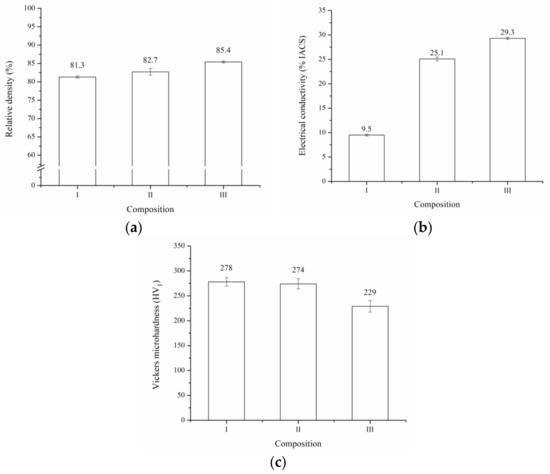 (a) Relative density (b) electrical conductivity and (c) Vickers microhardness for the three compositions under study.