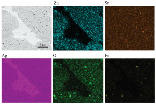 The relation between the electrical conductivity and composition is shown in Figure 8b. The electrical conductivity of the samples increased with increasing ZnO content in the initial combination of powders. This is mainly due to the reduction of porosity as a result of the increase in the relative density (Figure 8a) and the reduction of the Sn content in the Ag-rich solid solution (Figure 6a). It has been reported that the electrical conductivity of Ag solid solutions decreases sharply with the increase of solute content [49]. The above becomes relevant if we consider that, during the sintering process, a preferential diffusion of the Ag-Sn solid solution occurs, producing regions that are free of oxides (SnO2 and ZnO) and Zn, as seen in Figure 9, which shows as an example a BSE cross-sectional image of a sintered sample of composition II and its respective EDS elemental mapping. This analysis also detected small Fe-rich areas, which indicates contamination from the erosion of balls and vial during the milling process.