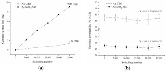 Due to their higher densification and electrical conductivity, sintered samples of composition III were selected to be tested for 25,000 on-off switching operations in a resistive circuit at 220 V AC and 35 A. Composites samples of composition I and II were not tested. A commercial Ag-CdO contact material was submitted to the same test conditions for comparison purposes. The composite Ag-SnO2-ZnO presented a more significant mass loss than the commercial Ag-CdO (Figure 10a), which is mainly due to the low densification reached during the sintering process. It is well known that porosity negatively affects the arc erosion resistance of the materials [56]. Figure 10b shows the electrical conductivity as a function of the on-off switching operations. As seen, there was no appreciable variation in the electrical conductivity for both materials during the electrical contact tests.