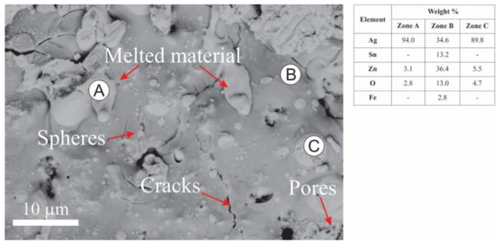 Figure 11 shows the surface morphology of eroded material and EDS analyses of marked regions. The action of the electric arc generated the segregation of the elements on the material surface. The high energy dissipated by the electric arc melted the surface layers of the contact, generating regions rich in Ag (Zone A) and sectors with a high concentration of Zn, Sn, and O (Zone B). The appearance of these segregated areas could be explained by the poor wettability between the oxides (ZnO/SnO2) and molten Ag [57]. Additionally, small spheres with diameters ranging from several hundred nanometers to ~10 µm can be observed on the surface, which presented a high Ag concentration. Those spheres were principally formed by the splash of liquid Ag during arc erosion.