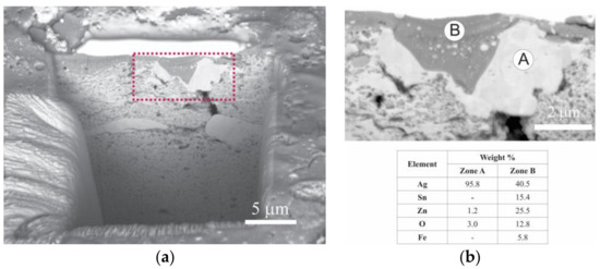 For an in-depth study of the eroded surface, the piece was cross-sectioned with a FIB and analyzed by FEG-SEM. Figure 12 shows the results obtained. A surface layer with a high concentration of Sn, Zn and O generated due to the action of the electrical arc (Zone B) can be observed. Under this layer, a region with a high Ag concentration is localized (Zone A). Moreover, it is possible to detect tiny particles of the Ag-rich phase dispersed within the oxide surface layer. As mentioned above, this stratification phenomenon is related to the poor wettability between molted Ag and the oxides (SnO2 and ZnO), which produces segregation on the material’s surface [57].