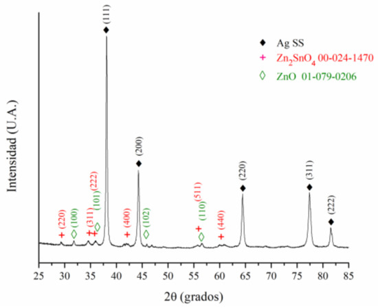 Based on the BSE images of the cross-sectioned sample, it could be concluded that the surface layer of the oxide presents a very homogeneous chemical composition. This could be attributed to a possible reaction between SnO2 and ZnO during the electrical contact test. To verify this supposition, the eroded sample was analyzed by XRD. The results obtained can be seen in Figure 13. The presence of an Ag solid solution, ZnO and Zn2SnO4 was detected, confirming the reaction between SnO2 and ZnO on the surface of the material according to the following reaction: